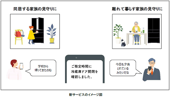 新サービスは、専用のスマホアプリを通じて、インターネット接続された冷蔵庫のドア開閉情報を確認。離れた場所からでも家族の暮らしぶりを「さりげなく見守れる」というもの。