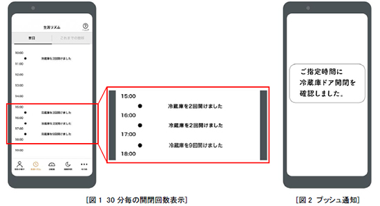 専用のスマホアプリ上で、冷蔵庫のドアが開閉された回数を30分毎にタイムラインで表示。この履歴から、離れて暮らす親の暮らしぶりや、自宅で留守番をしている子どもの様子なども確認することが可能とする。