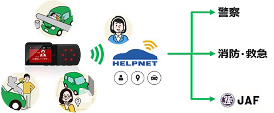 事故時や車両トラブルの際には、ドライブレコーダーから手動で『HELPNET』のオペレーションサービスへ通報。オペレーターが状況に応じて警察・消防・JAFロードサービスへ接続してくれるという。また、緊急通報と同時に「位置情報」や「車両情報」などをオペレーターに自動送信されるため、見知らぬ土地や気が動転して説明が困難な状況でも「確実な情報伝達が可能」だという。
