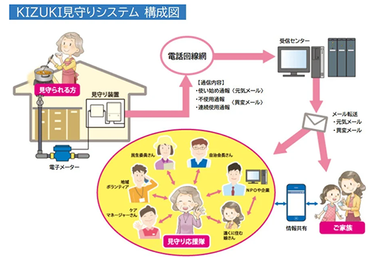 『KIZUKI』は、例えば1日で最初に水道を使ったとき『元気』のメッセージが登録者のメールアドレスに毎日送信されたり、「水道が2時間以上出しっぱなしになっているとき──」「数時間以上水道を使っていないとき──」などの『異変』もメールで通知される。仕組みは、水道に電子メーターが取りつけられるだけなのでプライバシーに関する抵抗も少ないとされる。