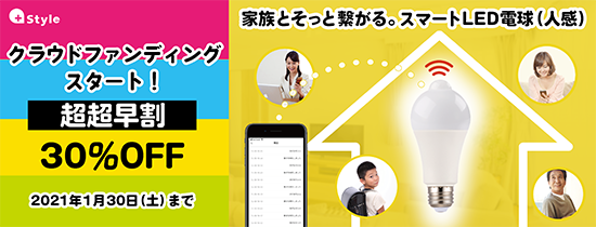 プラススタイル(東京都港区)では、『スマートLED電球(人感)』と『スマートLED電球(RGB調色)』を、応援購入サービス『Makuake』において先行販売を開始した。(2020年12月28日より)製品の詳細については正式発売時に改めて発表するとしている